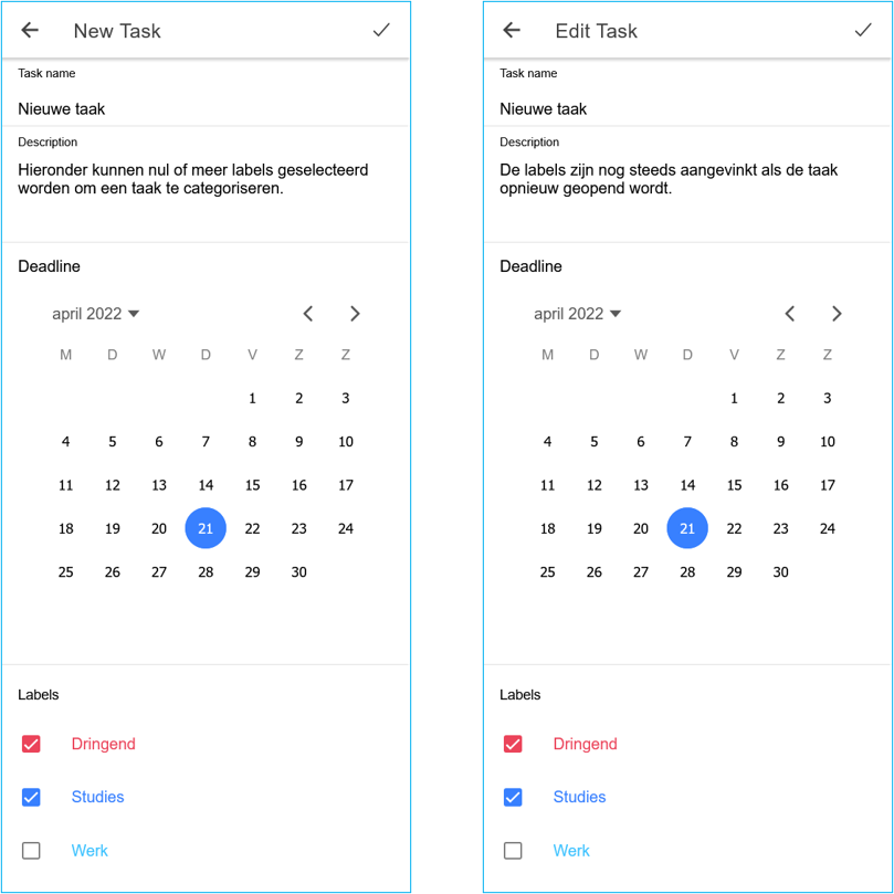 Implementeer de functionaliteit om een label toe te voegen of te verwijderen via de TaskPage component. Het formulier op deze pagina toont een lijst van alle labels, elk label krijgt de gepaste kleur. Het is vanzelfsprekend dat deze wijzigingen bewaard worden en nog zichtbaar zijn als je terugkeert naar de HomePage component en daarna terug naar de TaskPage component navigeert voor diezelfde taak.
