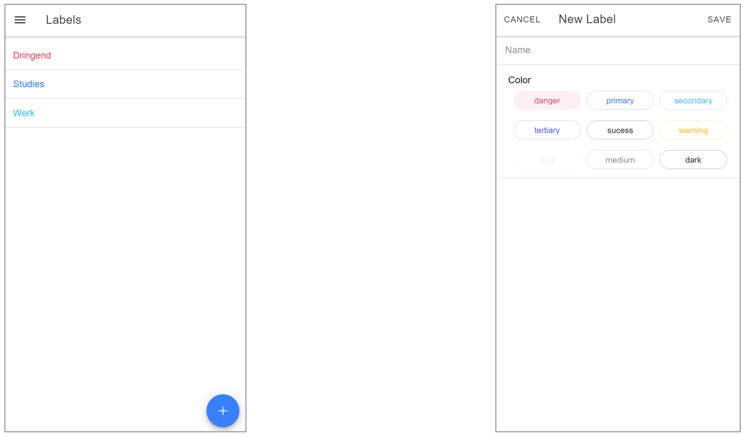 De interface Label bevat 3 velden, name, color en id. De kleuren worden in een enum gedefinieerd en zijn: primary, secondary, tertiary, success, warning, danger, light, medium en dark.