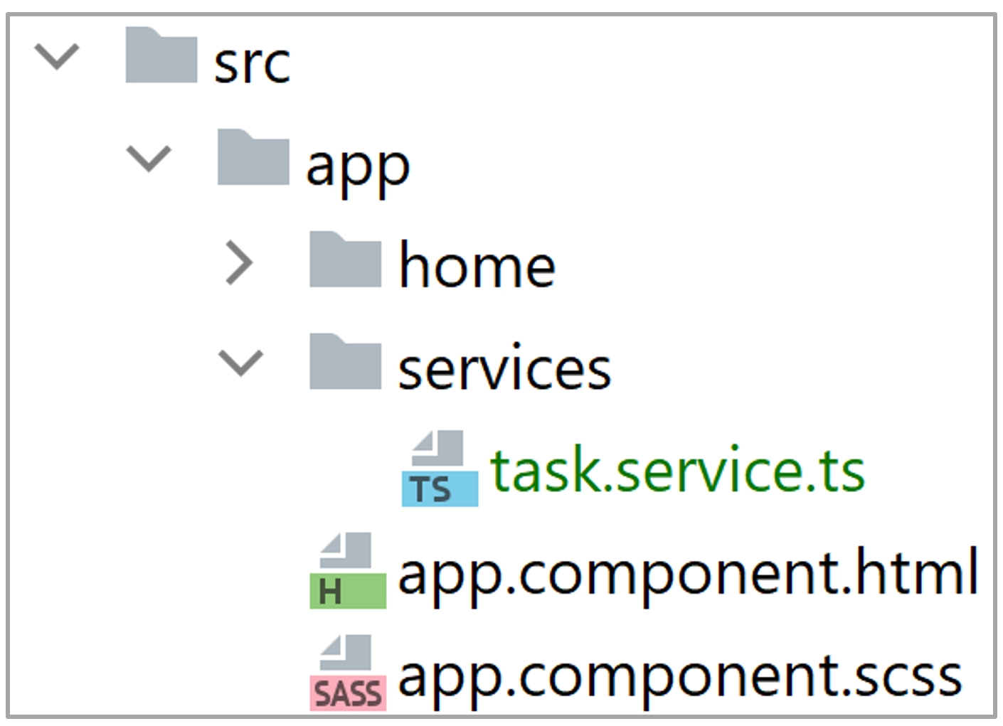 Het routerLink directive werkt steeds relatief ten opzichte van de pagina waarop het directive zich bevindt. We moeten als waarde dus task (zie home-routing-module.ts) meegeven aan het directive. Willen je toch een absoluut pad gebruiken, dan moet dit voorafgegaan worden door een forward slash ('/').